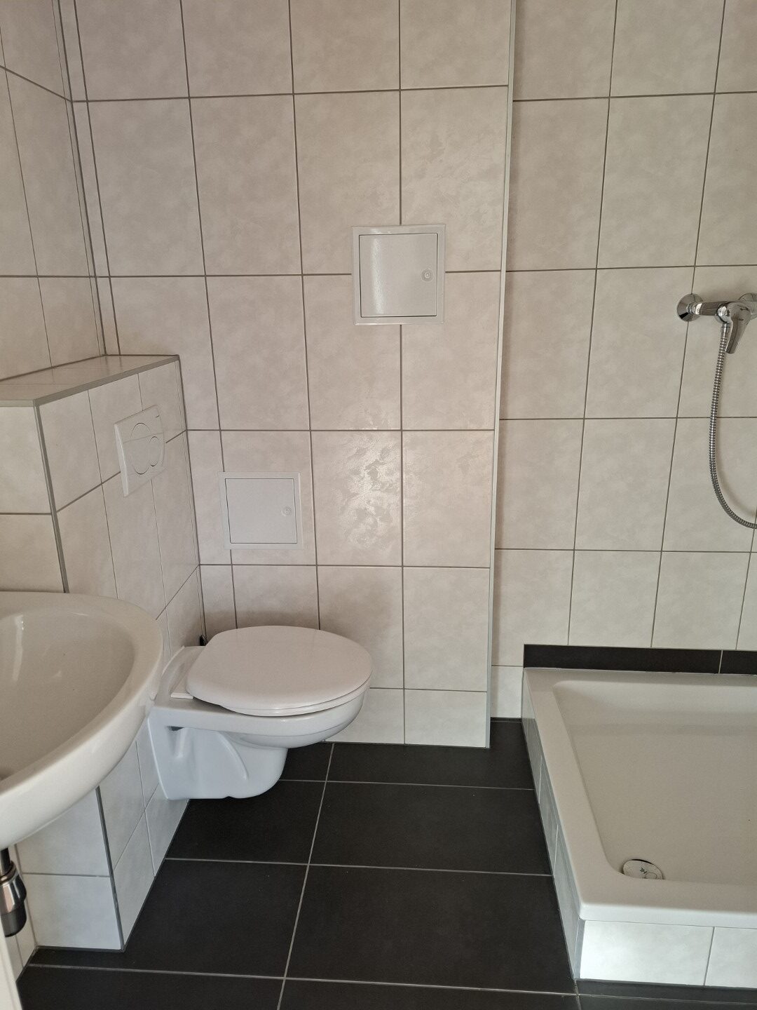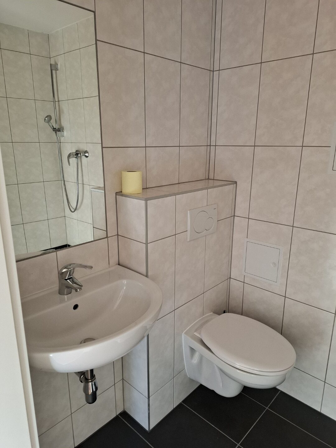 Es gibt einen kleinen Waschraum mit Toilette und Waschbecken und Dusche
