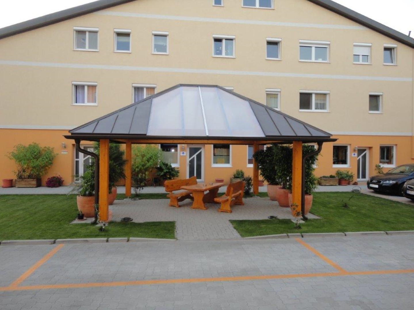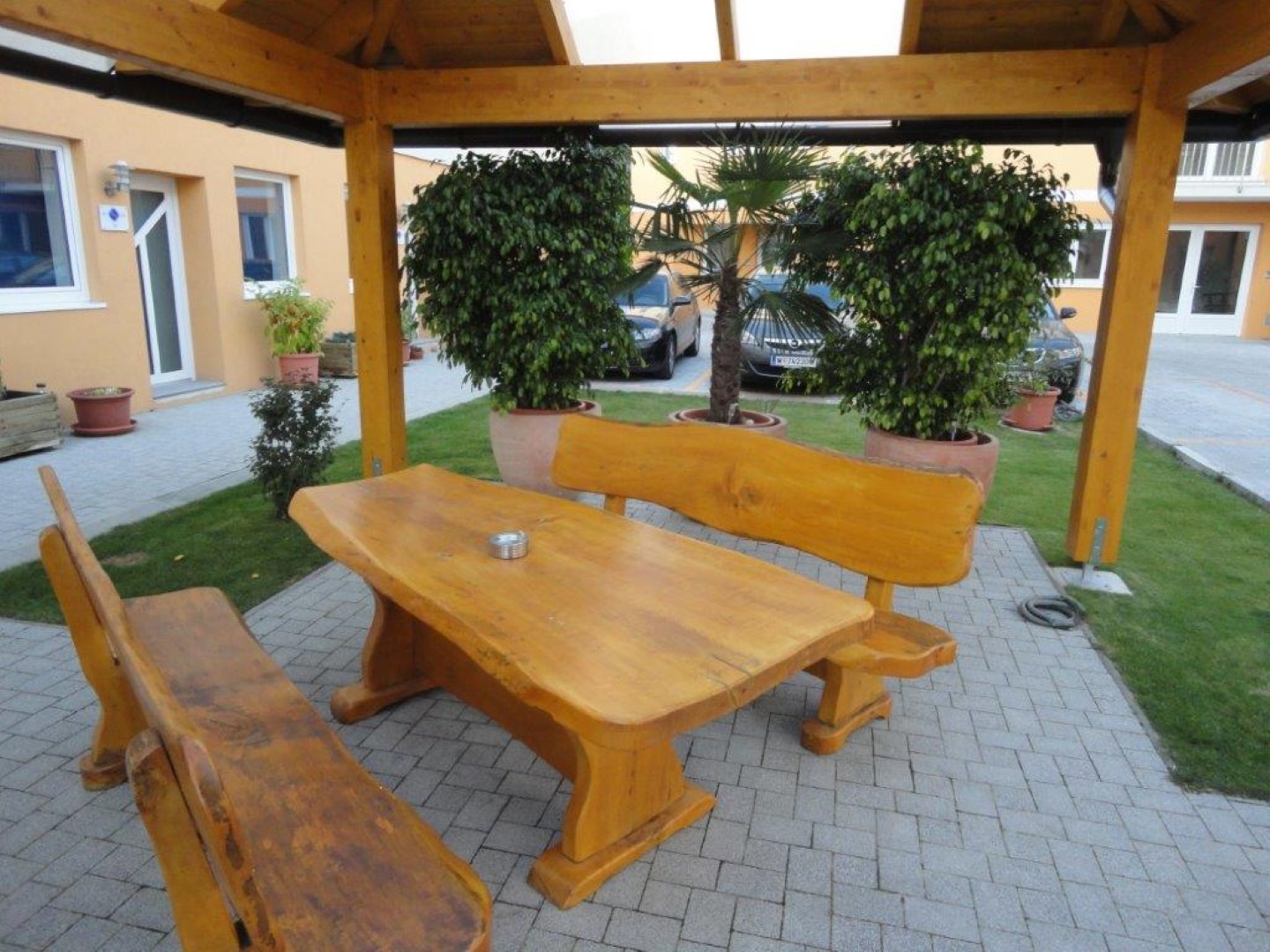 Gerne können sie die überdachten Bänke in der Grünanlage benutzen und vielleicht auch ihre Kunden hier mit Cafe verwöhnen.
